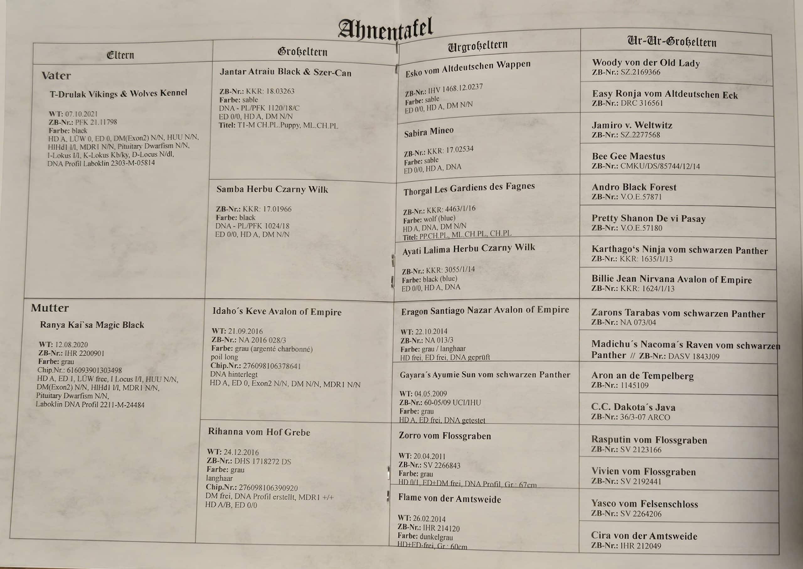 O Korum tem uma genética incrível sendo preto smoke, portador de preto sólido assim como de lobeiro. Tem no seu pedigree o famoso Eragon Nazar, cão que adoramos pela sua força, energia e intensidade que transmite à sua descendência assim como o Zorro Flossgraben um cão DDR que confere uma estrutura de cabeça e ética de trabalho de excelência.